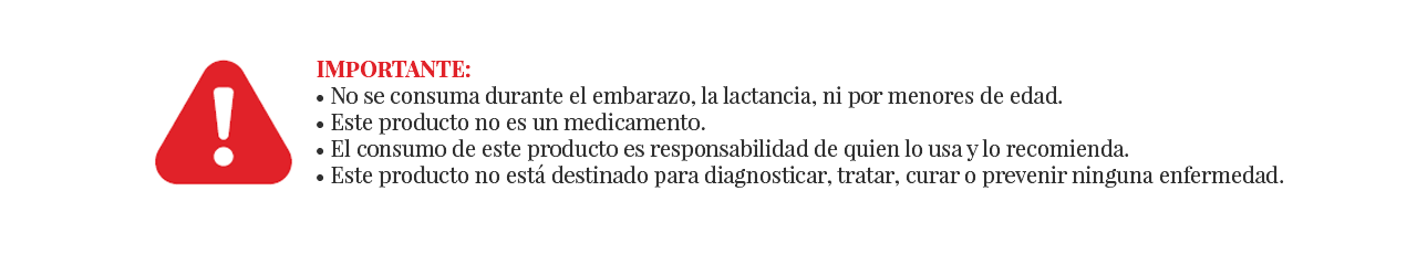 IMPORTANTE: Este producto no está destinado para diagnosticar, tratar, curar o prevenir ninguna enfermedad. El consumo de este producto es responsabilidad de quien lo usa y quien lo recomienda. Es recomendable consultar a tu médico antes de consumir cualquier producto adicional a tu dieta y alimentarte sanamente.